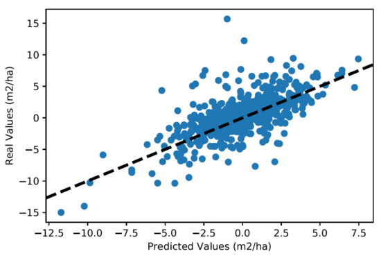 Despite their relative simplicity, linear models can be significantly improved by transforming the endogenous and exogenous variables. The exogenous variables (features) are each subjected to a standard scaling (noted by an apostrophe in Equation (7) above). This usual transformation is obtained by removing the mean and scaling to unit variance. The endogenous variable is subjected to a Yeo-Johnson transformation [30]. This transformation is noted by a double apostrophe in Equation (7). This non-linear transformation can reduce the skewness of a distribution and solves the heteroscedasticity problem that was visible on the residuals plots. This transformation is similar to the Box-Cox transformation [31], which is better known, but it accepts negative values as an argument, which is necessary in our case. The Yeo-Johnson transformation improved the performance of the models of classes 1 to 12 (as a reminder, classes are 5 cm wide, and the center of a class in cm = (#class − 1) × 5 + 20). For classes 13 to 16, this transformation did not improve performances, and it even deteriorated them. The transformation was therefore applied only to classes 1 to 12. These two transformations (standard scaling of the exogenous variables and Yeo-Johnson transformation of the endogenous variable) were performed separately for each model. B-splines transformations [32,33] on the exogenous variables were also tested. This type of non-linear transformation, related to the generalized additive modeling (GAM) approach, allows for non-linearity effects between the respective exogenous variables and endogenous variable. The use of this transformation did not produce strong and unambiguous results (performances were slightly better for half of the diameter classes and slightly worse for half of the diameter classes with no particular order among these diameter classes). By principle of parsimony and to keep a common structure to our models, this transformation was left aside.