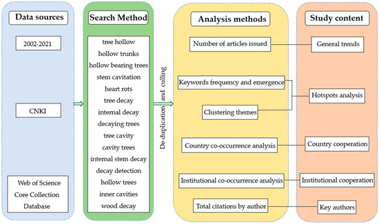 In summary, the studies related to tree trunk hollowing and decay in forest ecosystems have received a great deal of attention from scholars in many countries and have become one of the most important research hotspots in forest ecosystem management and conservation. In the face of the vast amount of literature in this field, it is necessary to gain a comprehensive understanding of the current research progress, research hotspots, and developments of tree decay research in the forest ecosystem. Using a systematic and accurate bibliometric approach with a combination of quantitative and qualitative visual dissection can provide a more accurate and comprehensive review of relevant research in this field. Therefore, this study comprehensively reviewed and summarized the scientific literature related to forest tree trunk decay and hollowing obtained from the CNKI (China national knowledge infrastructure) and Web of Science core collection databases during the period 2002–2021 by using CiteSpace (v.5.8.R3 Philadelphia, PA, United States) knowledge mapping software and bibliometric analysis. The aim is to present a clear and objective overview of the research, research developments and processes, and trends in this research area and to identify and distill the latest research hotspots and future trends that will not only provide scientific reference and inspiration for future research on hollow rot trees but also contribute to the conservation and sustainable management of forest ecosystems.