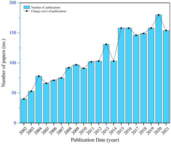 The amount of relevant literature was less than 40 articles per year on average prior to 2002, and they were mainly focused on the basic questions and developing basic concepts, which was at the initial stage. The number of articles published between 2002 and 2010 gradually increased but with little fluctuation. During this time, a large number of empirical studies were published based on previous studies that continue to provide empirical and sophisticated research methods. The number of papers produced in 2011 was more than double that of the initial stage, with the number surpassing 100; the research interest in the study of hollow rot in forest tree trunks continued to grow internationally. A significant increase in literature output of up to 180 articles by 2020 represents a boom in the field during this period. In contrast, the literature in Chinese shows a slow-growth trend, with an average of fewer than 25 articles from 2002 to 2021, and the average annual number of Chinese publications on CNKI is quite a few compared to the WoS database.
