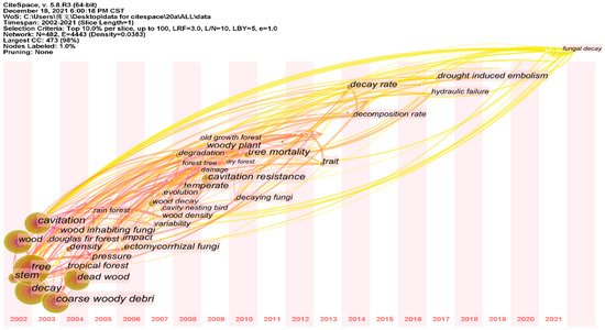 The CiteSpace Timezone map provides a visual representation of the research frontiers in different time zones and their derivative relationships, allowing for reasonable predictions for future developments [19]. Keywords provide a high-level overview of the hotspots of research in the literature and are the core of the literature. The term “burst” refers to the detection of words that have a high rate of change in frequency over a certain period of time from a large number of subject words by examining the word frequency. The keywords with high emergence are those with a high rate of frequency change over a certain period of time, reflecting the hotspots of research and indicating the frontiers and trends of research. The temporal evolution of the hot spot keywords for forest trunk hollow rot was plotted (Figure 3), with a node size proportional to frequency; the color of the plot from red to yellow represents the progression through time, and the color on the annual ring of the node corresponds to the time chromatogram. CiteSpace settings: Node Types; Keyword; Selection Criteria: Top 10%; and default settings are used for the rest. The production of high frequency and emergent keyword information tables are shown in (Table 1).