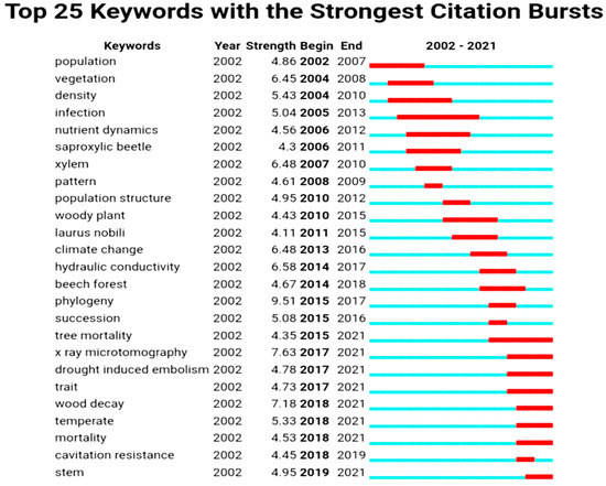Developmental phase (2005–2011): A large number of emergent and high-frequency terms appeared in this phase, indicating that decay and cavity trees have become a research hotspot, with related ecological concepts and new measurement techniques and emerging methods, and expanding the research fields. The following keywords, as “dynamics”, “forest”, “diversity”, “growth”, “decomposition”, “wood”, “coarse woody debris”, “conservation”, “community”, “management”, and “cavitation”, have the highest frequency of over 100 times. Studies involving the keywords “forest”, “decay”, and “decomposition” refer to the direct causes of wood “decay” and the necessary conditions required for “forest” and “decay”. There are also factors influencing decay, etc. [31,32,33]. Studies using the keywords “tree” and “cavitation” refer to hollow tree formation and influencing factors [12,34,35]. By exploring the keywords, scholars were mainly concerned with the mechanisms of hollow rot formation in forest stands and its prevention and management. The study received increasing attention after 2007, when “wood decay” appeared with the strongest change in frequency [36]. In addition, “climate change”, “vegetation”, “xylem”, and “hydraulic conductivity” all burst above 6, with representative studies and publications appearing in which scholars considered the relationship between vegetation and different environments [12,35] and explored ways to counteract tree decay and hollowing.