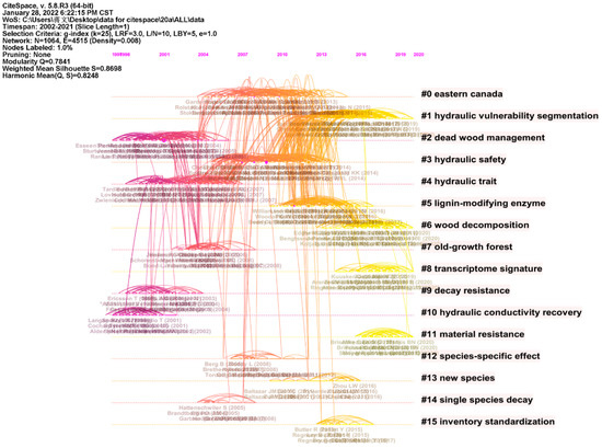 From Figure 5 and Table 2, it can be seen that the four themes with cluster sizes above 100 are “Eastern Canada”, “hydraulic vulnerability segmentation”, “deadwood management”, and “hydraulic safety”, with “Eastern Canada” referring to research focusing on tree species in Eastern Canada, for instance, boreal balsam fir (Abies balsamea (L.) Mill.) forests of Quebec, in Eastern Canada, Eastern Canadian black spruce (Picea mariana (Mill.) Britton, Sterns & Poggenb), sugar maples, and so on. The word “deadwood management” has the highest S-value. Deadwood management has received much attention from researchers, as it is critical to the processes, structural complexity, and biodiversity of forest ecosystems [46], and therefore research on deadwood management contributes to maintaining the carbon balance of forest ecosystems and the sustainable health of various biological resources. As the changes in the hydraulic characteristics of tree trunks caused by the external environment have attracted the attention of scholars [47,48,49], the subject of “hydraulic vulnerability segmentation”, and “hydraulic safety” has been studied more often.