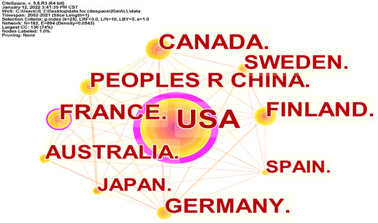 The analysis of the literature published in different countries reflects, to some extent, the importance and influence of that country in the field. As can be seen from Figure 6 and Table 3, the US is ranked top in the number of articles published in this research area (722), with a centrality of 0.62. These two indicators are both higher than those of other countries, and the US has laid the foundation and provided prior reference and scientific basis for other countries to carry out research in this area. Apart from the United States, research conducted to date in this area has been concentrated in France (193), Canada (191), Germany (164), Finland (163), China (159), Australia (116), and Sweden (116). China ranked sixth with 159 publications while ranking third with a higher centrality (0.05), which also reflects the high importance China attaches to the promotion of ecological civilization and forest conservation and its high academic status internationally. The scope of research has expanded from regional to global scale. This field of study is closely linked in a diamond shape between countries.