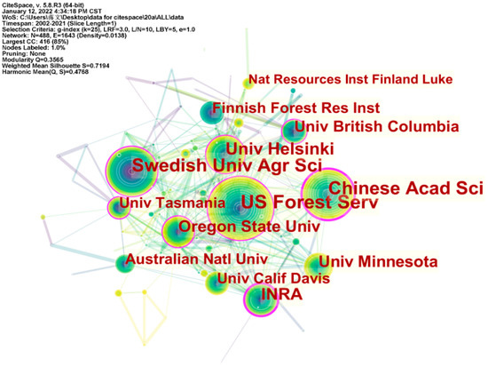 Analyzing the distribution of research institutions can help to understand the level of academic support and recognition of the field, thus facilitating collaboration between institutions. The node size is proportional to the number of articles; CiteSpace settings: node types: institution; selection criteria: top 50; other default settings are used (Figure 7). The United States accounted for three of the top 10 publishers, with 141 articles from the US Forest Serv, 62 from Oregon State Univ, and 62 from Univ of Minnesota; Finland accounted for two, 82 at Univ Helsinki and 43 at Finnish Forest Res Inst; Swedish Univ Agr Sci was second with 108 articles; Chinese Acad Sci was third (107); French National Institute for Agricultural Research (INRA) was fifth (66); Univ of British Columbia was eighth with 48 articles, and Australian Natl Univ was ninth with 43 articles. There are only two institutions with a centrality above 0.2: the Chinese Acad Sci is 0.22, and the INRA is 0.28. There are a large number of publishers, with US Forest Serv in the first place and dominating the list. The complex and tight connections between the institutions indicate close cooperation between them.