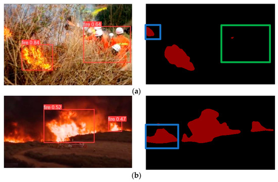 The complex environment of the forest makes the characteristics of forest fires change. For example, irregularities in the shape of the flame target due to leaf and branch shading can render the previously learned shape features inapplicable. Another complicating factor is that overexposure or underexposure in strong or low light conditions causes losses in texture and color characteristics in the forest fire images. These external change models inevitably present many situations that lead to missed and false detections. Considering that our model is composed of multiple tasks, we combined their respective characteristics in order to obtain better performance and reduce false and missed detections. For segmentation and detection tasks, although both share feature extraction and feature fusion modules, the tasks are different and the utilization of features is different. The semantic segmentation task is pixel point-based and focuses more on fine-grained category differentiation, while the object detection task is regression box-based and focuses more on regional differentiation. As shown in Figure 7, the false detections and missed detections that occur in the detection task are well identified in the segmentation task, while the missed detections that occur in the segmentation task are well detected in the detection task.