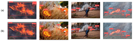 However, there are still some limitations in our research. Firstly, small target detection is difficult to address fundamentally, due to the small amount of pixel information that is characterized. Our method only improves the detection quality from the perspective of data balancing. Secondly, smoke is a relatively common feature of early fires, and our model is not adapted for smoke. Finally, due to the complex environments in forests, the problem of shading by covered vegetation can render our model useless, while traditional sensors such as temperature and humidity sensors, infrared cameras, etc., are not affected. Therefore, multi-sensor fusion is also one of the main directions for future study.