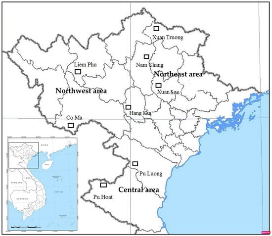 The genetic differentiation (FST) of loci ranged from 0.088 (amen3) to 0.665 (amen5), with an average of 0.29, indicating that 29% of the genetic variation existed among A. argotaenia populations, while G’ST values varied in the range between 0.104 (amen9) to 0.756 (amen5), with an average of 0.443. The average value of gene flow (Nm) was 1.17, ranging from 0.208 (amen1) to 2.587 (amen3). Pairwise FST values between A. argotaenia populations ranged from 0.01 to 0.376 (Table S3). The highest FST value was found between the two populations of Hang Kia and Pu Luong (0.376), while the lowest value was detected between Nam Chang and Xuan Truong (0.01). Significant differentiations were detected between populations (p < 0.01), except for the FST values for three pairs, Xuan Truong and Nam Chang, Xuan Son and Xuan Truong, and Co Ma and Liem Phu. Low FST values were found between populations in the same area. These were 0.02, 0.027 and 0.056 for the Northeast, Northwest and Central areas, respectively. Analysis of molecular variance (AMOVA) showed that 32.49% of the genetic variation were among areas (p < 0.001). The smallest proportion (2.57%) of variation was among populations within areas. The greatest proportion (64.95%) of variation was related to heterozygosity within populations (Table 3). These were confirmed by the values FST, G’ST and Nm (Table 1). Various clustering methods were used to identify the genetic groups of A. argotaenia populations. The Neighbor-joining (NJ) analysis determined three groups (Figure S1). The three populations of Xuan Son, Xuan Truong and Nam Chang in the Northeast area were clustered together with a bootstrap value of 86%. The three populations of Co Ma, Liem Phu and Hang Kia in the Northwest area were clustered into the second group with a bootstrap value of 95%. The remaining two populations of Pu Luong and Pu Hoat in the Central area were clustered into the third group with a bootstrap of 99%.