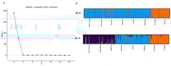 The Bayesian analysis showed two peaks (Figure 2a) with K = 2 (deltaK = 760.6) and K = 3 (deltaK = 312.4). However, the optimal number of genetic groups (K) was two, with the highest value of deltaK (760.6) obtained from Structure Harvester. At K = 2, the bar plot of admixture assignment for each individual was shown in Figure 2b. All individuals exhibited admixture from the two genetic groups. The ancestry percentage of individuals and each population in the two groups was shown in each color. The first group (blue) was predominant in six populations containing two areas of Northwest and Northeast (Figure 2b) with strong ancestry values ranging from 82.3% (Xuan Son) to 99.1% (Hang Kia), with an average of 93.6% (Table S4). The second group (orange) included the remaining two populations in the Central area with ancestry values of 95% (Pu Luong) and 98.1% (Pu Hoat). At K = 3, all populations in the same area were clustered together into distinct groups (Figure 2b). One group (orange) included two populations of Pu Luong and Pu Hoat in the Central area, with ancestry values of 94.6% and 96.9%, respectively. The second group (blue) included three populations Xuan Son, Xuan Truong and Nam Chang in the Northeast area, with ancestral values 86.3%, 87.4% and 88.4%, respectively. The third group (violet) included the remaining three populations Co Ma, Liem Phu and Hang Kia in the Northeast area, with ancestry values 84.8%, 85.8% and 93.1%, respectively. The Puechmaille approach showed three groups based on the estimator MedMeanK, MedMedK, MaxMedK and MaxMeanK (Figure S2). Although the K = 3 model showed a lower deltaK than the deltaK value at K = 2.