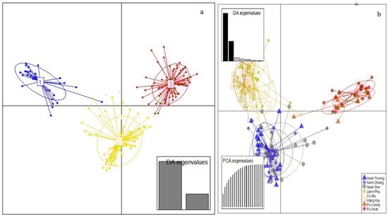 The K = 3 models were supported by the results of the Puechmaille estimator. Disriminant analysis of principal components (DAPC) without prior information also showed three genetic clusters (Figure 3a). All individuals from the two populations Pu Luong and Pu Hoat, except for one individual in Pu Luong were assigned to cluster 1 (Table S5, Figure S3). Two individuals, one in Nam Chang and one in Liem Phu were also assigned to this cluster. The second cluster included all individuals from the three populations of Xuan Truong, Nam Chang and Xuan Son, except for two individuals one in Xuan Truong, one in Xuan Son, and two in Nam Chang. However, some individuals from Liem Phu, Co Ma and Pu Luong were assigned to the second cluster. Most individuals from the remaining three populations were assigned to the third cluster. This cluster was composed of three individuals, one from each population, Xuan Truong, Nam Chang and Xuan Son. DAPC with prior information on population origin revealed individuals within and among populations (Figure 3b). The high overlap of clusters showed low genetic differentiation between populations in the same area. The results indicated that high overlap was detected between populations in the Northeast area, with the FST values ranging from 0.01 to 0.033, with an average of 0.02. Similarly, a high overlap was found between populations in the Central area (FST = 0.056) and between populations in the Northwest area with an average of FST value = 0.093 (0.016–0.043). High genetic differentiation among A. argotaenia populations was identified between different areas. The highest degree of differentiation was found between the Northwest population and the Central population, with an average FST value = 0.311 (0.272–0.376). High genetic differentiation was found between the Northeast population and Central population, with an average of FST value = 0.236 (0.201–0.258), and between the Northwest population and Northeast population, an average of FST value = 0.149 (0.12–0.165).