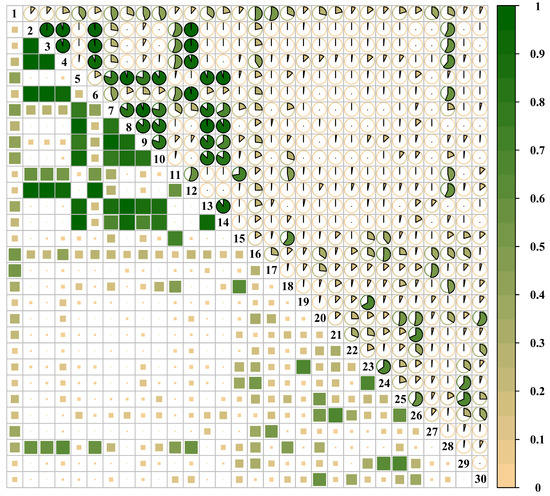 The ecological niche overlap index. The numbers represent the plants in Table 1. The numbers of 1 to 15 represent herbaceous plants, and 16 to 30 indicate woody plants. The larger the square or sector, the darker the color, the larger the Oik.