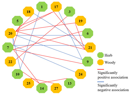 The results of the χ2 tests (Figure 3, Supplementary Materials) showed that, the χ2 statistic was less than 3.841 for more than 90% of the species pairs in all three scenarios. There were 25 significantly associated species pairs. Meanwhile, Table 4 shows that the strongest positive linkage among herbaceous species pairs, followed by woody plants, and the weakest herb + woody in the three scenarios. There were 16 pairs of significantly positively associated species pairs and 9 pairs of significantly negatively associated species pairs.