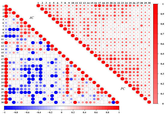 Interspecific associations strength. Lower is AC values, upper is PC values. The numbers represent the plants in Table 1. The larger the circle, the redder the color and the larger the value; the smaller the circle, the bluer the color and the smaller the value.