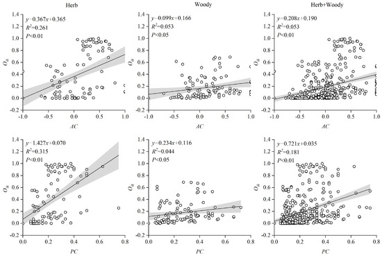 Regression analyses between the interspecific association coefficients (AC and PC) and Oik for herbs, woody plants and, herbs + woody plants. The dark color lines indicate the fits of the linear model, while the ribbon are the 95% confidence intervals of these linear models.
