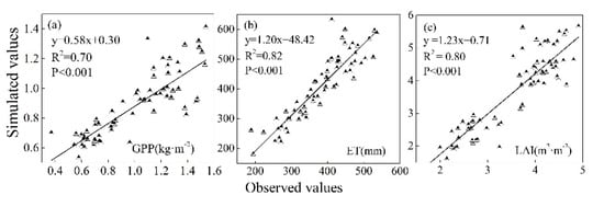To evaluate the accuracy of the LPJ-GUESS model in simulating the GPP, ET, and LAI of the LP, we selected 51 natural vegetation points through field investigation (Figure 1). The sampling points were extracted from the corresponding MODIS products (https://modis.gsfc.nasa.gov/) (accessed on 5 December 2021) during 2001–2020 according to their geographical location, including the GPP, ET, and LAI values. The annual remote sensing observation data extracted from the MODIS products were fitted linearly with the data simulated from 2001 to 2020 by the LPJ-GUESS model. The average coefficient of determination (r2) and the average Nash–Sutcliffe Efficiency (Ens) between the observed and simulated values of GPP, ET, and LAI were 0.77 and 0.53, respectively. In this study, acceptable model performance was considered when r2 > 0.6 and Ens > 0.5 [35] (Figure 2).