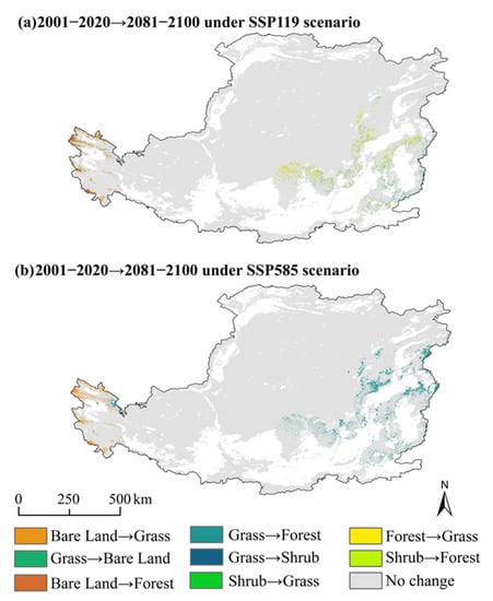 During 2081–2100, the vegetation distribution on the LP showed distinct spatial heterogeneity (Figure S1), where forests were mainly centered in the south and southeast, accounting for 10% of the total area in the LP under the SSP119 scenario, and 11% of the total area in the LP under the SSP585 scenario. (Table S2). Grasses were mainly centered in the north and northwest, accounting for 63% of the total area in the LP under the SSP119 scenario, and 61% of total area in the LP under the SSP585 scenario. (Table S2). Although the spatiotemporal distribution of each vegetation type in the future period (2081–2100) was analogous to that of the historical period (2001–2020), conversions among the vegetation types occurred from the historical to the future period (Figure 3). The most noteworthy conversions were projected to occur at the end of the century (Table 2). Compared with 2001–2020, the area proportion of the shrub and grass was predicted to be transformed into forest accounted for more than 1% of the total area in the LP and mainly distributed in the Lvliang and Taihang Mountains under the SSP119 scenario during 2081–2100. In contrast, the area proportions of the forest, shrub and bare land were predicted to be transformed into grass accounted for 8%, 6%, and 76% of the total area in the LP during 2081–2100 under the same scenario. Under the SSP585 scenario during 2081–2100, all bare land in the Western high-altitude area was predicted to be transformed into grass, and the area proportion of the shrub and grass was predicted to be transformed into forest accounted for more than 1% of the total area in the LP, respectively. These conversions of vegetation types from the historical period to future period suggest that future climate change will influence the spatiotemporal distributions of vegetation types.