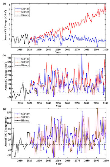 The simulated trends of CS, SC, and WC in the future period under the two scenarios were quite different (Figure 4a–c). The reason is that we used scenarios with high and low forcing and greenhouse gas emissions to predict future ecological functions, and these scenarios included a range of possible future climatic changes such as temperature, precipitation, radiation, and carbon dioxide concentrations. The SSP119 scenario is represented by a low temperature, with the temperature rise in this century controlled at 1–2.4 °C and low atmospheric CO2 concentrations. Under the SSP585 scenario, the temperature increase by the end of the century would be 2.8–5.7 °C. This leads to very different outcomes for the two future scenarios, and it is an approach that is often considered in current research aimed at predicting the future period [29,43,44].