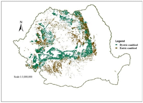 In Romania, the most widespread forest soils are dystric cambisol (2,292,385 ha), haplic luvisol (1,440,052 ha), eutric cambisol (869,909 ha), entic podzol (447,657 ha), preluvisol (soil type from the Romanian classification, included in the international classifications as luvisol) (335,050 ha) and fluvisol (330,564 ha) []. In hilly and mountainous areas, the most widespread soils are eutric cambisol and dystric cambisol (Figure 1).