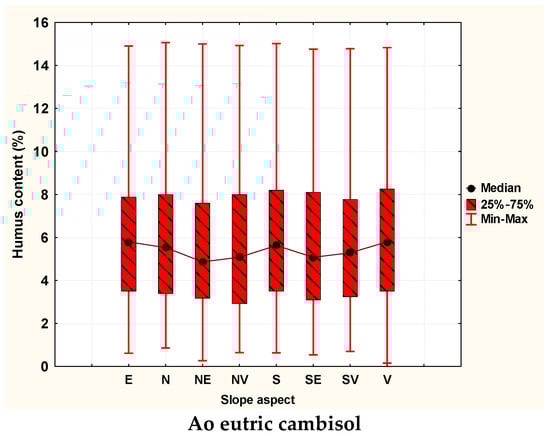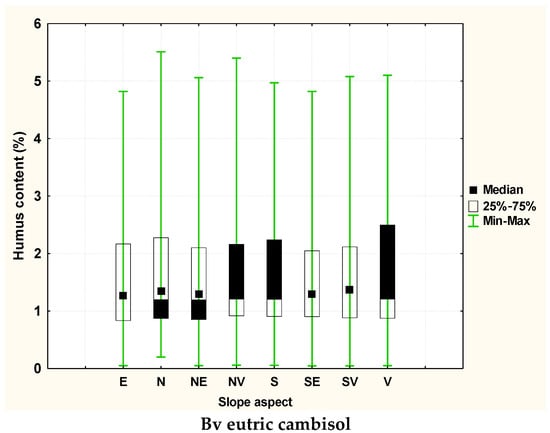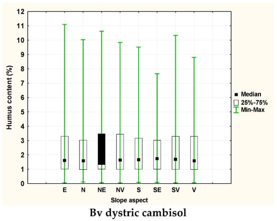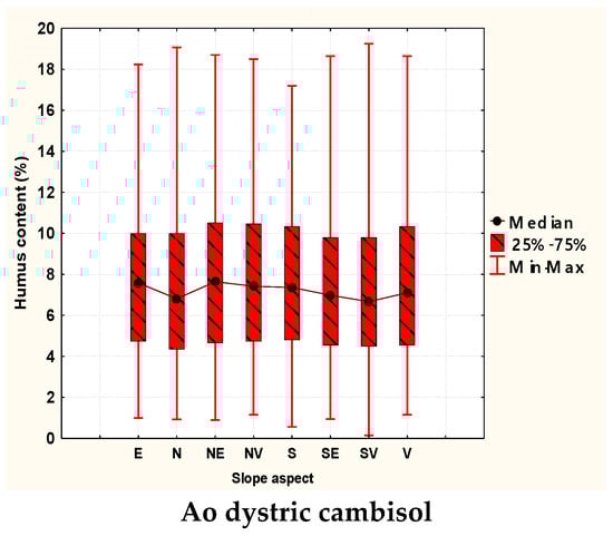 Dystric cambisol and eutric cambisol were similar regarding the median value of soil organic matter content in the Bv horizon. This is almost constant with close values for both soil types from all slope aspects. The lowest soil organic matter values for the Ao horizon were found on the shaded slope aspects (N, NE) and on sunny slope aspects, meaning on the two extreme situations. The highest values in the Ao horizon for both soils were found on the shaded and partially shaded slope aspects [,]. Soil organic matter and soil properties can be influenced to a certain degree by the main elements of topography, respectively, elevation and slope aspect [,].