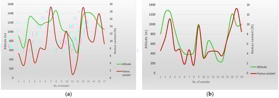 Correlation between soil organic matter content and altitude ((a)—dystric cambisol; (b)—eutric cambisol).