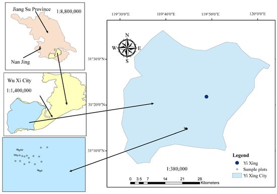 The experimental sample plots were set in Yixing, Jiangsu Province (31°15′1″–31°15′40″ N, 119°43′52″–119°44′41″ E). The average precipitation is 1167 mm, the temperature is 15.7 °C, and the annual evaporation is 886.8 mm. The area is mainly low mountains and hills and the soil type is yellow clay (GB/T 17296-2009). The vegetation type is moso bamboo forest.