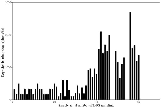 Using these characteristics, we selected sample plots of different groups in the Yixing state-owned forest farm to investigate the DBS. The investigation period was from March to May 2019 and the investigation event lasted for 50 days. Bamboo shoots unearthed in the sample plot were observed daily to determine whether they survived. The TSPs cover a wide range of bamboo forests with varying stand structures, stand densities, bamboo sizes, bamboo ages, site productivity, terrain, and environment. All diameters at breast height (DBH ≥ 5) were measured to obtain the DBH, height to crown base (HCB), and number of bamboo shoots (NBS). We used the direct counting method to obtain the NB, NBS, and DBS. Subsequently, various measures describing bamboo stand density were derived from these measurements. The distribution patterns of the DBS are shown in Figure 3. The bamboo stand variables are presented in Table 2.