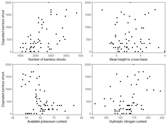 Scatter plot distribution between degraded bamboo shoots (DBS) and different predictor variables used for modeling DBS for moso bamboo (number of bamboo shoots (NBS), mean height to crown base (MHCB), hydrolytic nitrogen (HN), and available potassium (AK)).