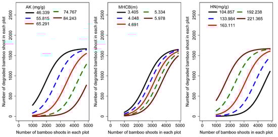 We evaluated the simulation effects of predictors (MHCB) and soil nutrient content factors (AK and HN) describing the characteristics of bamboo forests on the DBS of the logistic model (Figure 5). The three predictors have a significant impact on the change in DBS (Figure 5). DBS decreased with increasing MHCB and AK but decreased with increasing HN. AK and HN contributed the most to variations in DBS, followed by MHCB.