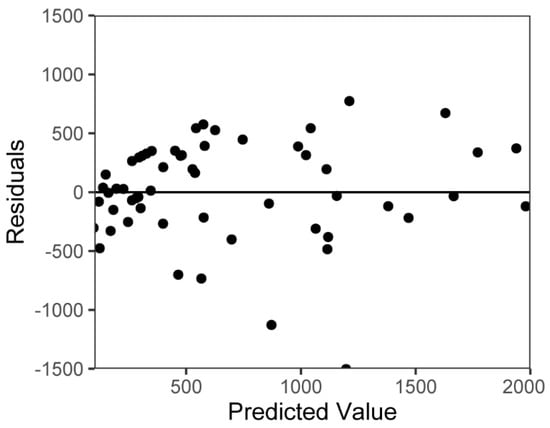 Among the three tested variance functions (Equation (14)–(16)), the power function (Equation (15)) most effectively accounted for the variance heteroscedasticity (Table 6, Figure 6). The RMSE and TRE values of the NLME DBS Model (21) were (RMSE = 364.7028; TRE = 20.8995) based on the full dataset. Therefore, we added the random effect to β3, which produced the largest R2 (0.6596) and was assumed to be an optimal NLME model to estimate DBS, that is, the final NLME model form given by