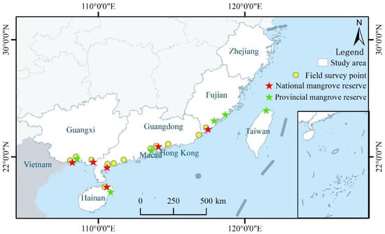 Mangrove-growing areas in China are mainly distributed in the Guangxi Zhuang Autonomous Region, Guangdong, the Hainan province, the Fujian province, the Zhejiang province, Hong Kong and Taiwan [,], which are located within 18°12′–30°09′ N and 108°03′–122°00′ E. The mangrove species in China mainly include Kandelia candel, Aegiceras corniculatum, Bruguiera gymnorhiza, Excoecaria agallocha, Avicennia marina, Rhizophora stylosa, Sonneratia apetala, etc. []. In addition, the number of mangrove species gradually decreases from south to north in coastal cities. The climate is mainly tropical and subtropical maritime monsoon, with warm and humid winters, hot and rainy summers, abundant precipitation, high relative humidity, average annual temperatures of 17.7–25.4 °C and an average annual rainfall of 1200–2200 mm. There are seven national mangrove nature reserves and six provincial mangrove nature reserves in China (Figure 1) [].