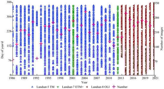 Surface reflectance (SR) data from Landsat-4 and subsequent Landsat-series satellites are available on GEE. This dataset was atmospherically corrected from the original data, while the resolution in the thermal infrared band was resampled to make the resolution uniform with the visible band. In this paper, we used the SR data of Landsat-5 TM, Landsat-7 ETM+ and Landsat-8 OLI in the study area for 1986–2021 provided by GEE, including the red, green, blue, NIR, SWIR 1 and SWIR 2 bands in six bands with a spatial resolution of 30 m. The dates and amount of data collected are shown in Figure 2.