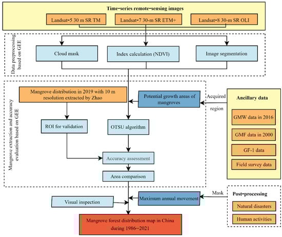 In this paper, based on the Landsat data stored on the GEE for 1986–2021, the NDVI was calculated by band calculation within the mangrove growth area. The index range for mangrove extraction was initially determined by combining with the OTSU algorithm, then the range was manually adjusted to achieve the optimal extraction effect through subsequent processing, and finally the 1986–2021 interannual Chinese mangrove distribution was obtained. A flow chart of the study is given in Figure 3.