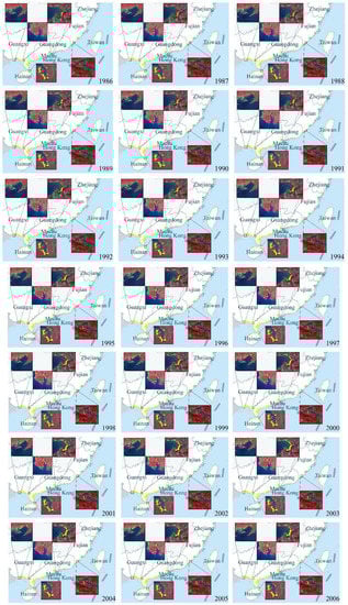 The extracted results were processed to remove patches that were isolated and less than a certain area value. For a certain year, the patches in the extracted results that belonged to mangroves were determined according to changes in the mangrove distributions in the first three years and the last three years of this study. By combining with relevant papers and references from various provinces and cities [,,,,], we set the maximum annual movement of the mangrove and seawater demarcation line to the land by natural disasters and damage such as human logging, and corrected the results of each year by establishing the corresponding buffer zone.