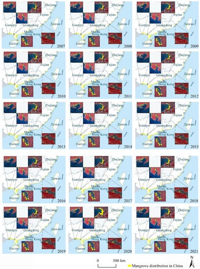 Google Earth Engine (GEE) is one of the world’s most advanced information processing cloud platforms, which can perform cloud computing of remote-sensing images and other Earth observation data []. It plays an important role in large-scale geographic data processing and long-term change monitoring []. For example, Xiong et al. [] combined Sentinel-2 and Landsat-8 data from 2015 to 2016 to map the extent of agricultural land across Africa based on GEE; Nguyen et al. [] used GEE and Landsat images to analyze the spatial variation of mangroves in the Thanh Hoa and Nghe An provinces, Vietnam from 1973 to 2020. GEE has various application areas, including forest and vegetation research [], and also plays an important role in the extraction of mangrove data with its data-processing cloud platform. For example, Diniz et al. [] proposed the modular mangrove recognition index (MMRI) for mangroves based on Landsat TOA images and used it to analyze the dynamic changes of mangroves in Brazil during 1985–2018 based on GEE, and Bhargava et al. [] studied the erosion and progradation of mangroves in the Sundarbans and French Guiana based on GEE. The extraction and analysis of mangroves in China based on GEE have been carried out: Chen et al. [] combined Landsat satellite image data and Sentinel-1 SAR data to generate a mangrove distribution map in China in 2015; Wang et al. [] used Landsat-7 ETM+ and Landsat-8 OLI time-series remote-sensing images to map the distribution of coastal wetlands in China in 2018 based on GEE; and Zhao et al. [] mapped mangroves in China at a 10 m resolution in 2017 using Sentinel SAR and optical time-series imagery. However, most of these studies focused on one or a few years, with little analysis of interannual dynamic changes.