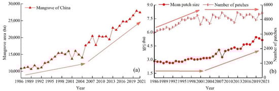 (a) Mangrove area and (b) the number of mangrove patches and MPS in China during 1986–2021.
