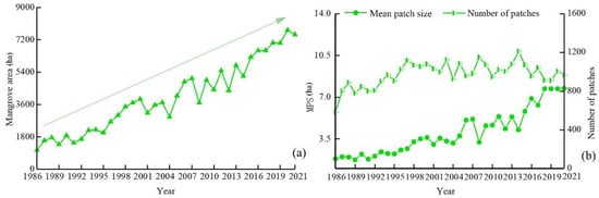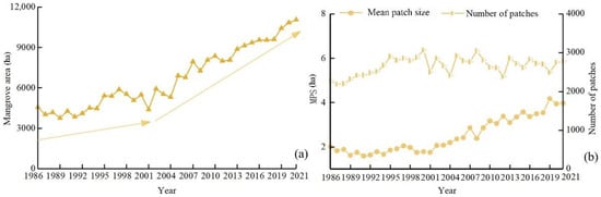 (a) Mangrove area and (b) the number of mangrove patches and MPS in Guangdong during 1986–2021.