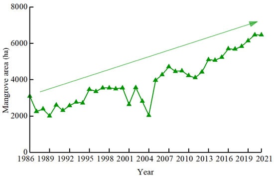 The ZMNR is located in Guangdong and encompasses the entire Zhanjiang area, with mangroves scattered and evenly distributed along the coast of Zhanjiang City. The number of mangroves is relatively large, with areas ranging within 2000–6500 ha (Figure 8) and accounting for about 60% of the mangroves in Guangdong. The mangrove area in the ZMNR decreased slightly during 1986–1989, and then showed an overall increasing trend, which was consistent with the establishment of the ZMNR in 1990. The mangrove area in the ZMNR significantly increased to 3959.89 ha in 2015 and slightly decreased in 2013, mainly because of O. cantonella damage after June 2012, which led to the extensive drying of mangroves. Since 2017, there has been a clearing of the mangrove protection zone farming ponds in Zhanjiang and, during 2017–2021, the mangrove area of the ZMNR increased steadily, reaching a maximum of 6468.42 ha in 2020, representing an increase of 3364.68 ha compared to 1986 (Figure 8). This proves that mangrove reserve construction has been effective.