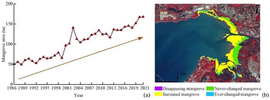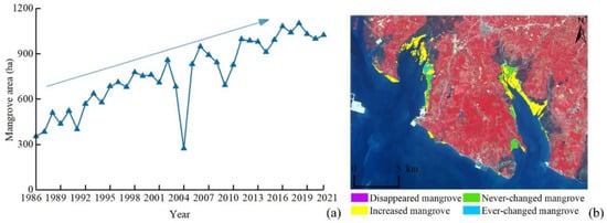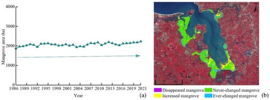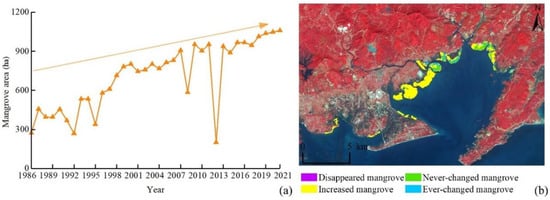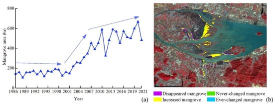 (a) Mangrove area and (b) changes to mangroves in ZNNR during 1986–2021.