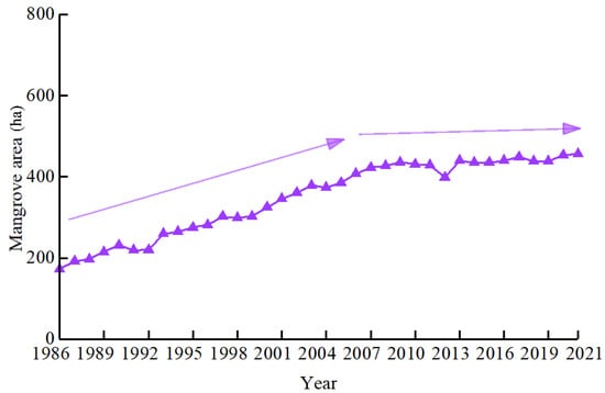 The FMNR is located in Shenzhen, Guangdong. It was established in 1984 and is the only national nature reserve in China that is located within an urban area. During 1986–2021, the area of mangroves in the reserve showed a relatively gentle increasing trend. The FMNR Management Regulations, which strictly prohibited the discharge of pollutants within the mangrove reserve and its peripheral zone, also explicitly prohibited the unauthorized cutting of mangroves, resulting in the mangrove area in the reserve reaching 140.31 ha in 2002. The “Eleventh Five-Year Plan” planned for more new mangroves in Shenzhen, and the Shenzhen Futian Mangrove Restoration Demonstration Project was launched in 2007. The mangrove area in the FMNR maintained an upward trend during 2005–2009, and reached a small peak of 134.01 ha in 2009 (Figure 9). In the past 10 years, the mangrove area in the FMNR showed a trend of decreasing and then increasing, and reached a maximum area of 167.82 ha in 2021, which was about 3.3 times that in 1986. The increased mangroves mainly extended toward the sea, and some mangroves on the northwest side extended toward the inland side; a central area extended along the river bank in the center of the reserve, and the distribution of mangroves in this area did not change.