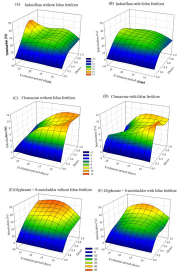Data were subjected to analysis of variance and differentiated by Scott-Knott grouping for the herbicide factor and F-test for the foliar fertilization factor for the variables height, stem diameter, shoot dry mass, and chlorophyll content. For intoxication, analyses of multiple linear regressions were performed, and 3D response surfaces were made. All statistical analyzes were performed at 5% significance.
