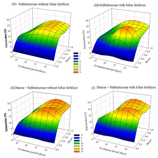 Intoxication of eucalyptus clone AEC 144 subjected to herbicides indaziflam (A,B), clomazone (C,D), glyphosate + S-metolachlor (E,F), sulfentrazone (G,H), and diuron + sulfentrazone (I,J), with and without foliar fertilizer application. (A): z = −9.06 + 52.73x + 1.15y − 37.84x2 − 0.03y2; R2 = 0.85. (B): z = −6.71 + 44.67x + 0.93y−29.21x2 − 0.02y2; R2 = 0.82. (C): z = −2.54 + 17.86x + 0.60y−10.72x2 −0.02y2; R2 = 0.81. (D): z= −2.54 + 20.71x + 0.51y − 11.28x2 − 0.02y2; R2 = 0.86. (E): z = −9.38 + 59.51x + 1.30y − 26.09x2 − 0.03y2; R2 = 0.91. (F): z = −14.33 + 41.90x + 1.83y − 8.77x2 − 0.04y2; R2 = 0.80. (G): Z = −4.85 + 45.14x + 1.08y − 30.10x2 − 0.03y2; R2 = 0.88. (H): z = −2.74 + 49.41x + 0.63y − 31.56x2 − 0.02y2; R2 = 0.93. (I): z = 2.76 + 48.34x + 0.23y − 37.41x2 − 0.02y2; R2 = 0.87. (J): z = −4.40 + 41.33x + 0.94y − 27.64x2 − 0.03y2; R2 = 0.81.