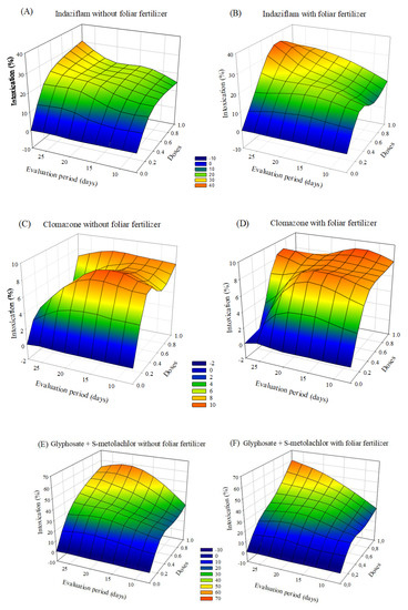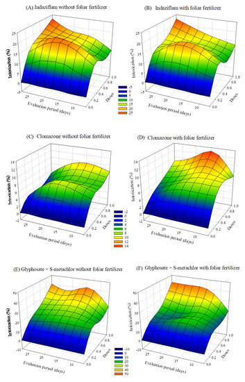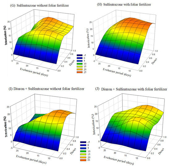 Intoxication of eucalyptus clone AEC 2034 subjected to herbicides indaziflam (A,B),clomazone (C,D), glyphosate + S-metolachlor (E,F), sulfentrazone (G,H), and diuron + sulfentrazone (I,J), with and without foliar fertilizer application. (A): z = −4.57 + 65.49x + 0.19y − 44.73x2 + 0.005y2; R2 = 0.81. (B): z = −8.72 + 65.97x + 0.83y − 43.23x2 − 0.01y2; R2 = 0.89. (C): z = −1.25 + 17.64x + 0.48y − 10.90x2 − 0.02y2; R2 = 0.72. (D): z = −1.83 + 22.42x + 0.41y − 14.75x2 − 0.01y2; R2 = 0.78. (E): z = −20.22 + 89.42x + 2.22y − 44.81x2 − 0.05y2; R2 = 0.81. (F): z = −18.90 + 74.58x + 1.91y − 31.94x2 − 0.04y2; R2 = 0.87. (G): z = −5.87 + 53.03x + 1.37y − 36.95x2 − 0.05y2; R2 = 0.89. (H): z = −2.32 + 59.58x + 0.65y − 38.58x2 − 0.02y2; R2 = 0.89. (I): z = −6.17 + 49.35x + 1.27y − 33.76x2 − 0.04y2; R2 = 0.88. (J): z = −9.11 + 54.28x + 1.47y − 37.79x2 − 0.04y2; R2 = 0.82.