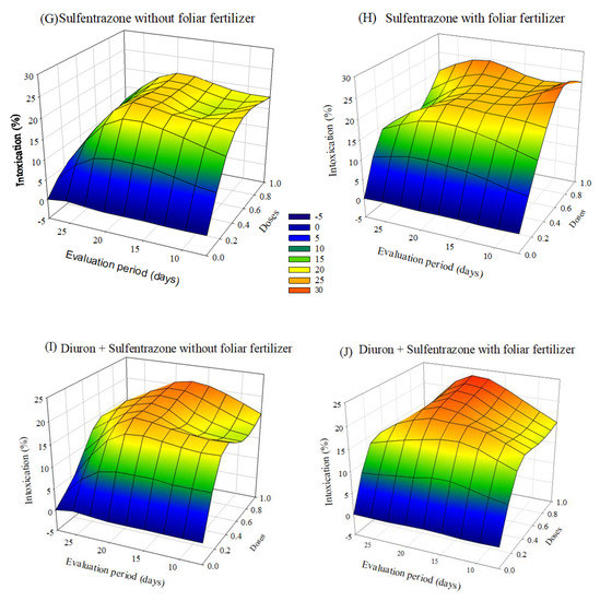 Intoxication of eucalyptus clone AEC 056 subjected to herbicides indaziflam (A,B), clomazone (C,D), glyphosate + S-metolachlor (E,F), sulfentrazone (G,H), and diuron + sulfentrazone (I,J), with and without foliar fertilizer application. (A): z = −11.76 + 77.29x + 1.15y − 55.01x2 − 0.02y2; R2 = 0.81. (B): z = −10.99 + 72.26x + 1.33y − 54.06x2 − 0.03y2; R2 = 0.93. (C): z = 1.34 + 19.59x + 0.23y − 12.78x2 − 0.01y2; R2 = 0.86. (D): z = 2.70 + 19.03x + 0.04y − 13.19x2 − 0.007y2; R2 = 0.77. (E): z = −19.23 + 74.01x + 2.43y − 38.43x2 − 0.06y2; R2 = 0.83. (F): z = −14.42 + 52.88x + 2.22y − 22.92x2 − 0.06y2; R2 = 0.92. (G): z = −3.24 + 52.83x + 0.99y − 38.25x2 − 0.04y2; R2 = 0.92. (H): z = 26.49 × exp(0.5 × (((x − 0.74)/0.42)2 + ((y − 14.30)/10.18)2)); R2 = 0.77. (I): z = −4.82 + 49.95x + 1.37y − 32.60x2 − 0.05y2; R2 = 0.91. (J): z = −5.07 + 47.67x + 1.39y − 34.84x2 − 0.05y2; R2 = 0.87.