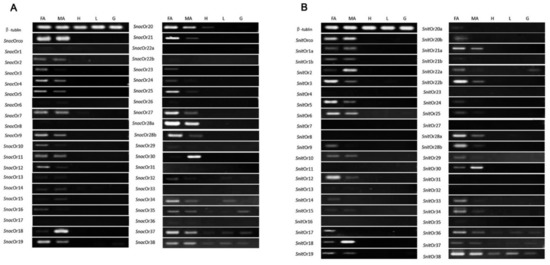 Tissue-specific expression of candidate OR genes were evaluated by RT-PCR. (A) S. noctilio, (B) S. nitobei. FA: female antennae; MA: male antennae; H: head; L: legs; G: genitals. β-Tubulin used as a reference gene for each cDNA template.
