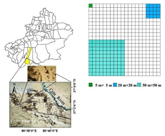 A 100 m × 100 m sample plot was set up in the northwest of the Qira Desert Ecosystem National Field Research Station of the Chinese Academy of Sciences in July 2019, where quadrats of three scales (50 m × 50 m, 20 m × 20 m, and 5 m × 5 m) were set up. Using the 5 m × 5 m quadrat as the basic unit, 100 quadrats were randomly selected at each scale within the sample plots. Where each 20 m × 20 m quadrat contains 16 quadrats of 5 m × 5 m and each 50 m × 50 m quadrat contains 100 quadrats of 5 m × 5 m (Figure 1).