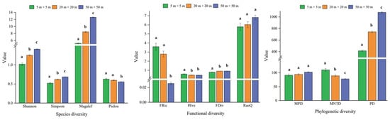 Among the species diversity indices, the Shannon diversity index, Simpson diversity index, and Margalef richness index tended to increase with scale and showed significant differences between scales (p < 0.05), and the Pielou evenness at large scales (50 m × 50 m) was significantly smaller than at small (5 m × 5 m) and medium scales (20 m × 20 m). For the functional diversity index, the RaoQ index showed an increasing trend from small to large scales. The FRic richness index, FEve evenness index, and FDiv divergence index were significantly different between small and large scales. The MNTD index of phylogenetic diversity showed a decreasing trend with increasing scale. The PD index showed an opposite trend and was significantly different between scales, while the MPD index was not significantly different between scales (p > 0.05) (Figure 2).