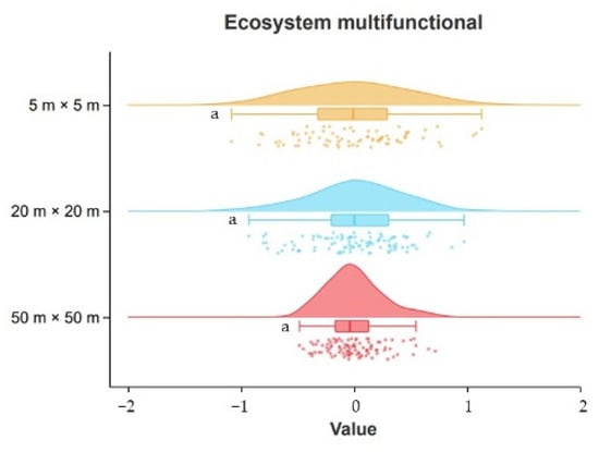 Using the K–S test and Raincloud plot (Figure 3), the ecosystem multifunctionality index calculated by the mean method was distributed normally at all three scales, with the values of the multifunctionality index varying from −1.085 to 1.129 for small-scale samples, −0.931 to 0.973 for medium-scale samples, and −0.484 to 0.718 for large-scale samples, but the ecosystem multifunctionality index did not vary significantly between scales (p > 0.05).