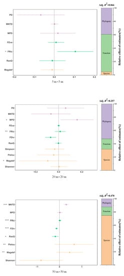 The model was selected in R4.1.3 using the function “dredge” from the “MuMin” package [], based on the corrected Akaike’s information criterion (AICc; ΔAICc < 2) []. A selection procedure was used to select the best predictor of ecosystem multifunctionality, and when multiple models were selected, model averaging was performed based on AICc weights. The model residuals were inspected for constant variance and normality. All predictors and response variables were standardized before the model was constructed. Predictors were log-transformed as necessary before analysis to meet the assumptions. The model calculated relative explanatory rates for each diversity index and compared them with the total explanatory rates for all diversity indicators in the model, after which the explanatory rates for the indices in the model were categorized and summed by species diversity, functional diversity, and phylogenetic diversity to obtain the relative importance of different diversity dimensions (species diversity, functional diversity, and phylogenetic diversity) as drivers of ecosystem multifunctionality.