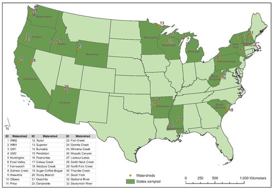 | State | ID | Watershed Location | Avg. Dominant/Co-dominant Tree Height (m) | Drainage Density of Headwater Streams (km km−2) 1 | Avg. Headwater Stream Network Percentage (%) 2 | Percent Watershed Area (%) | |