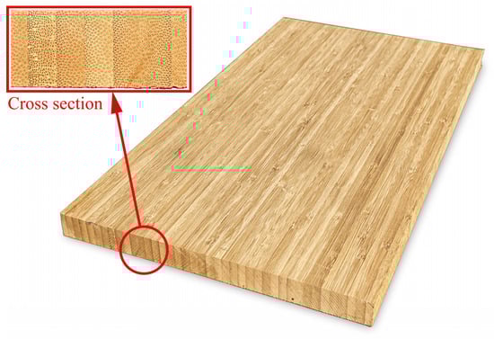 Bamboo panels, as shown in Figure 1, purchased from Aiwei Industrial Development Co., Ltd., Shanghai, China, were prepared with dimensions of 600 mm length × 300 mm width × 18 mm depth. Moso bamboo (Phyllostachys edulis) sheet composite board has become one of the most common materials in the decoration market, with high-pressure carbonization treatment used at present. The panels were made of multiple longitudinal bamboo strips glued with urea-formaldehyde resin, and their composite structure can be seen from the cross section. Tested according to GB/T 17657-2013, the modulus of rupture (MOR) and modulus of elasticity (MOE) of the workpieces were 46.8 ± 5.6 MPa and 4185 ± 223 MPa, respectively. The moisture content was between 7.9% and 10.1%, and the average density was 695.8 kg/m3. Experiments were conducted on a standard CNC machine (SYNTEC GMB-E, Weigete CNC Technology Co., Ltd., Jinan, China). Bamboo milling was performed with an initial temperature of 15 ± 2 °C and relative humidity (RH) of 52 ± 5%, using a straight-shank solid carbide milling tool with a diameter of 8 mm and edges number of 3 (Huhao Technology Co., Ltd., Hangzhou, China).