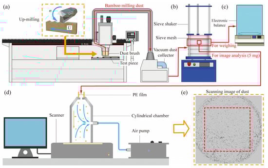 (a) Diagrammatic sketch of the CNC milling machine and vacuum dust collector; (b) sieve shaker; (c) electronic balance; (d) flatbed scanning image analyses; (e) scanning image of bamboo dust.